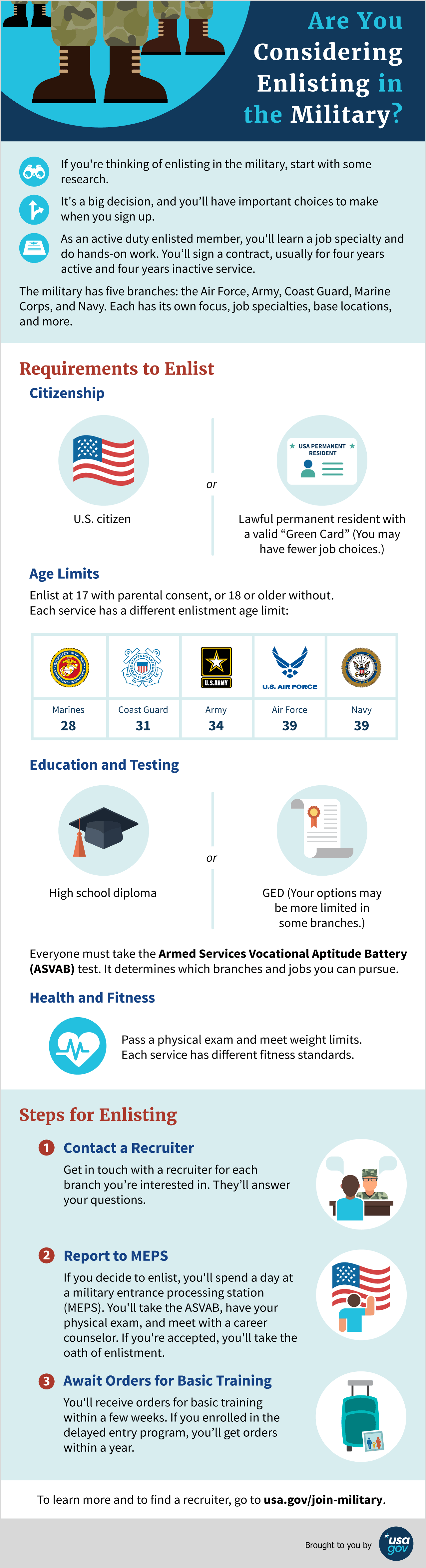 To join the military, any branch will require that you take the Armed Services Vocational Aptitude Battery (ASVAB) and have completed a high school diploma or G.E.D. You will also be required to pass a physical exam and fitness test.
